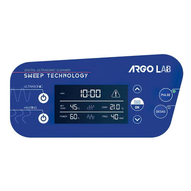 ARGOLAB DU-100S Sweep Generation, questa Tecnologia assicura un’intensità ultrasonica più uniforme ed omogenea nel liquido di lavaggio. È implementata per avere un processo di lavaggio più efficace ed un risultato più soddisfacente rispetto alla consueta pulizia ad ultrasuoni. Adottata per accrescere l’efficienza e le prestazioni dello strumento. Bagno ad ultrasuoni digitale con capacità: 10 lt, Fornito completo di cestello e coperchio in acciaio inox. Regolazione della temperatura fino a 60°C. Potenza riscaldante 500 W