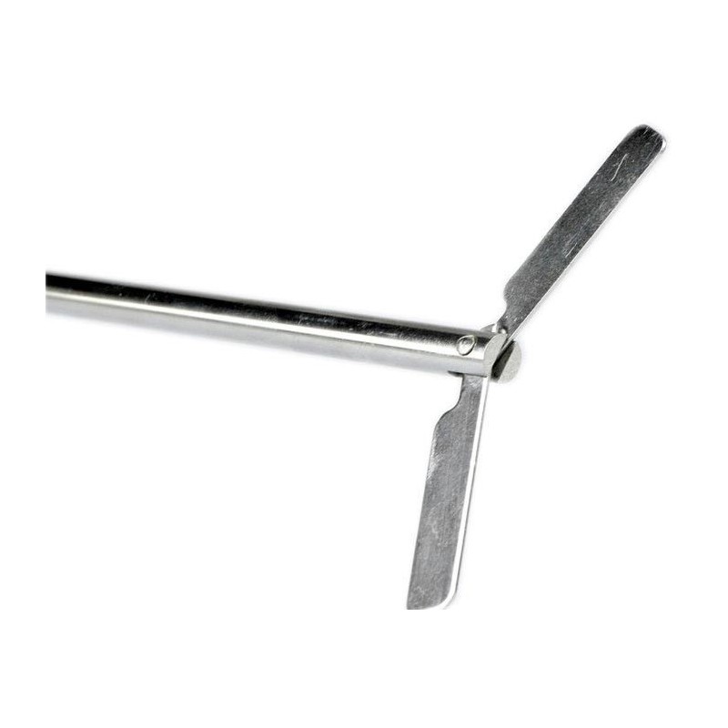 Asta per agitatori a pale flottanti Tipo 1. Le due pale, che si aprono all’aumentare della velocità, generano un flusso assiale nel recipiente dall’alto al basso. Particolarmente indicata per l’agitazione in contenitori a collo stretto, es. palloni.