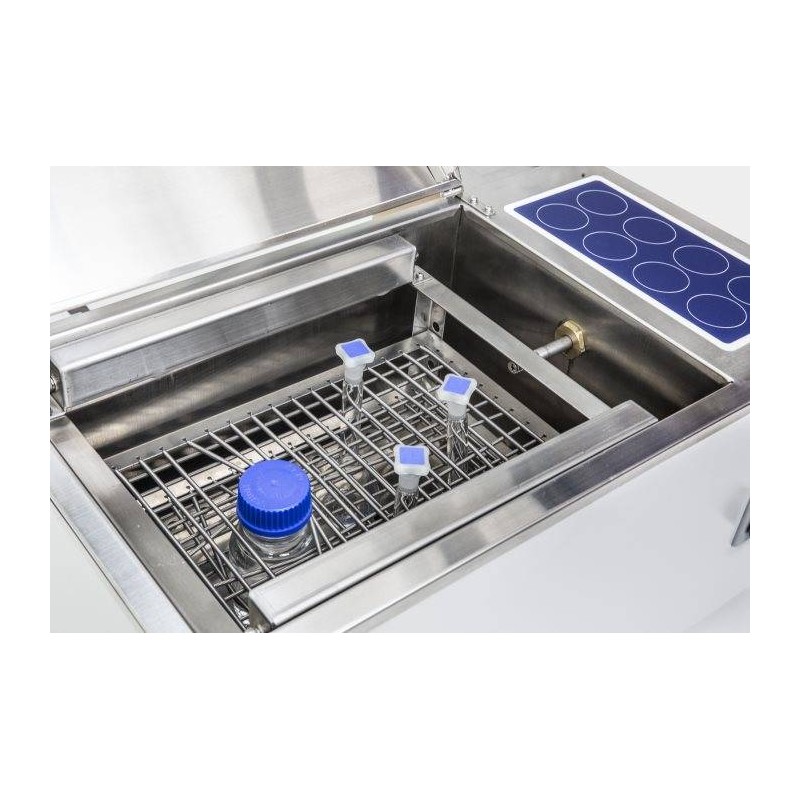 Campo di lavoro da 5°C sopra temperatura ambiente a 100°C. Capacità della vasca 35 litri. Regolatore elettronico della temperatura con controllo PID integrato. Classe di sicurezza 2. Stabilità della temperatura a 37°C: ± 0,5 °C, accuratezza della temperatura: ± 1 °C. Cestello universale con supporto a molle in acciaio inox (L x A x P) 320 x 115 x 200. Coperchio in acciaio inox incernierato alla vasca con foro da 5 mm per il passaggio di un sensore esterno per il controllo o la certificazione della temperatura. Tubo di svuotamento della vasca e valvola ad innesto rapido per il ricambio periodico del liquido. Peso: 28 Kg. Alimentazione: 230V/50Hz, potenza: 1250 W. Imballo e trasporto compreso.
