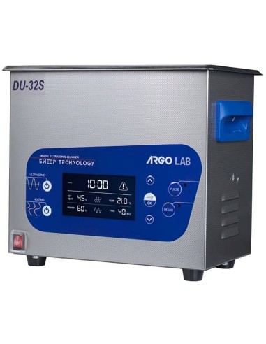 Bagno ad ultrasuoni digitale DU-32S ARGOLab Sweep Generation da 3.2 litri di capacità con riscaldamento. Controller digitale per impostazioni di temperatura ( max 60°c ) durata ( da 1 a 99 minuti) e due frequenze ultrasuoni (28 e 40 kHz) per adattarsi alle esigenze del processo e pulizia dell’oggetto per le varie tipologie di sporco e contaminazione. Prezzo base per uno dei modelli più venduti.