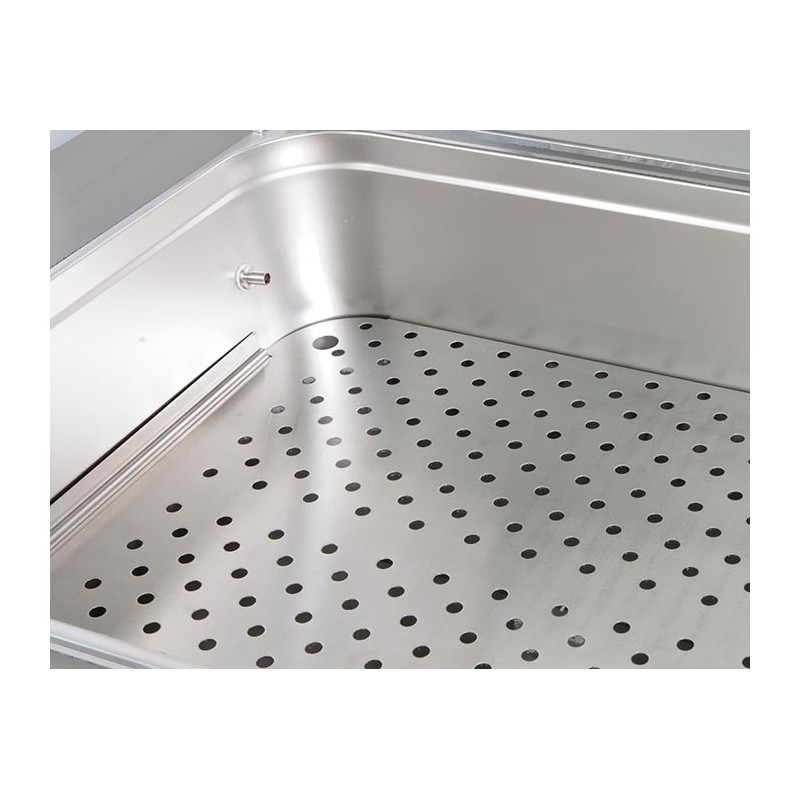 Coperchio in acciaio incernierato alla vasca con foro da 6mm per il passaggio di un sensore esterno per il controllo o la certificazione della temperatura.