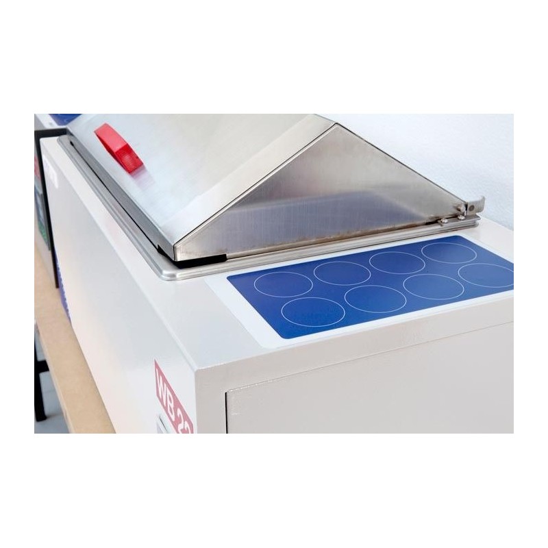 Coperchio in acciaio incernierato alla vasca con foro da 5 mm per il passaggio di un sensore esterno per il controllo o la certificazione della temperatura. Ampia gamma di rack porta provette disponibili. Peso: 12 Kg. Alimentazione: 230V/50Hz, potenza: 900W.