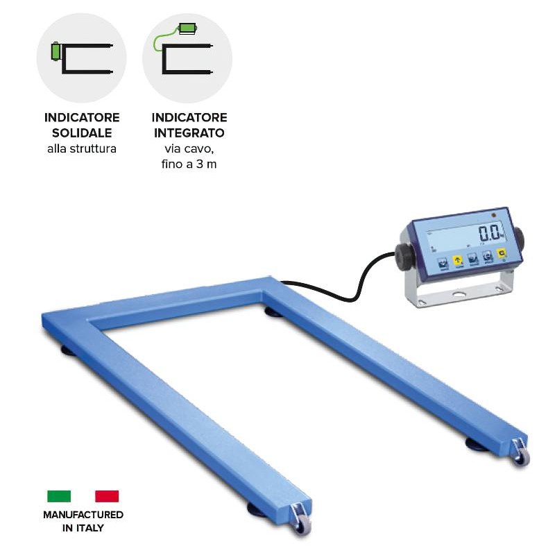 Funzionamento con 4 celle di carico shear-beam da 1000 Ohm in alluminio, omologate secondo norme OIML R60 C3 (3000+3000 divisioni), grado di protezione IP67, dimensionate al doppio del carico nominale. Struttura portante delle bilance pesapallet in lamiera di acciaio sagomata e verniciato a forno, completa di piedini regolabili. Bolla di livello, ruote e maniglia di trasporto. Cavo di connessione all'indicatore lungo 3 metri. Precisione della bilancia pesapallet: +/-0,05% della portata.