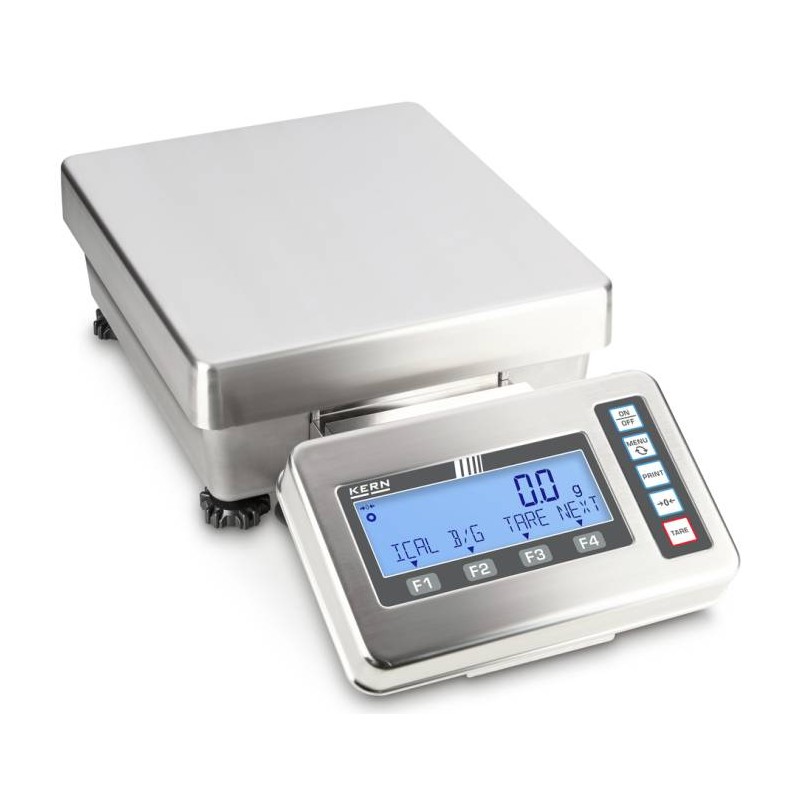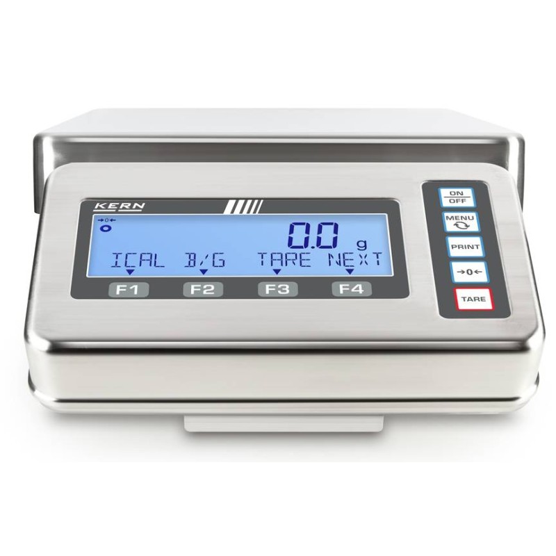 Bilancia KERN FES / FEJ FEJ con terminale di pesatura in acciaio inox e classe di protezione IP65, igenica facile da pulire. Struttura in metallo, robusto e stabile. I tasti funzione configurabili a piacere consentono di personalizzare le impostazioni della bilancia. Funzionamento intuitivo grazie alla riga informativa sul display. Protezione antipolvere e antispruzzo IP65 (secondo EN 60529)