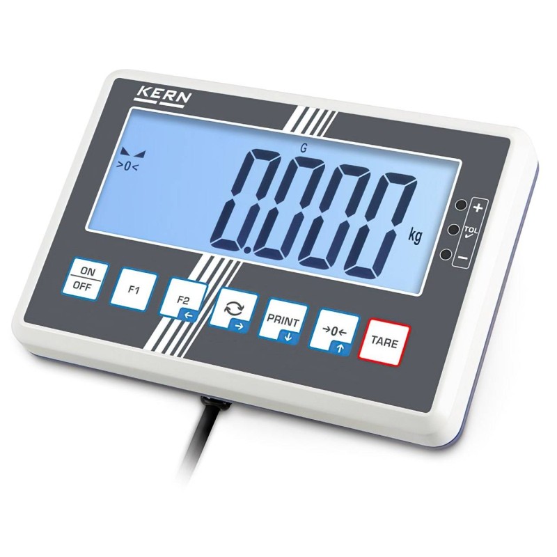 Display : Grande display LCD retroilluminato con altezza cifre 50 mm. Lunghezza cavo indicatore-piattaforma circa 5 metri. Alimentazione da rete elettrica o con batteria ricaricabile (vedi accessori).