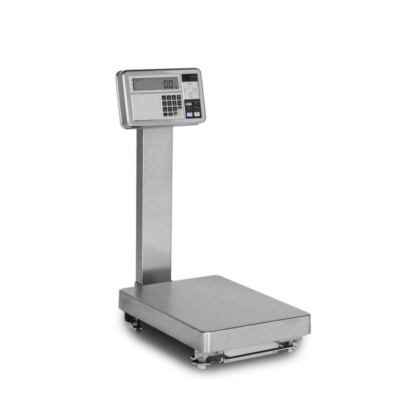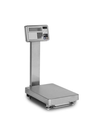 Tastiera impermeabile numerica e funzionale a 27 tasti. Display LCD a 9 cifre da 25 mm. Involucro in acciaio inox IP65. Sensore di pesatura con tecnologia a corde vibranti. Piatto in acciaio INOX.