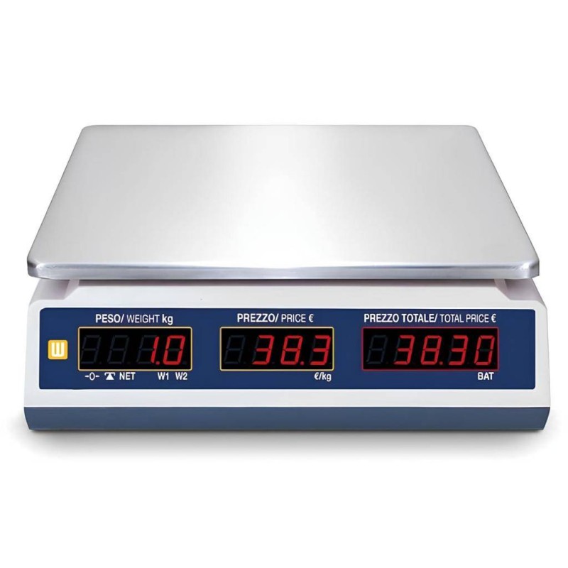 Bilancia peso-prezzo-importo per alimenti omologata [M] con stampante inclusa. Peso prezzatrice con stampa delle etichette. Display a LED ROSSI visibile anche in ambienti con poca luminosità. 102 memorie. Doppio display, anche lato cliente. Batteria inclusa, durata fino a 50 ore. Certificata HACCP / HCV / MOCA per alimenti.