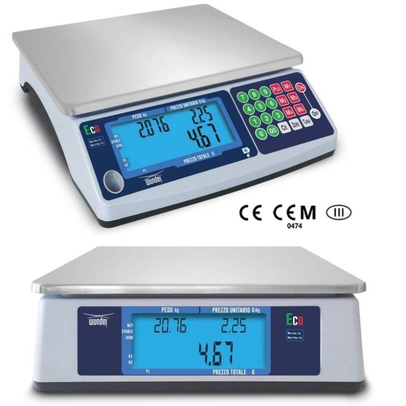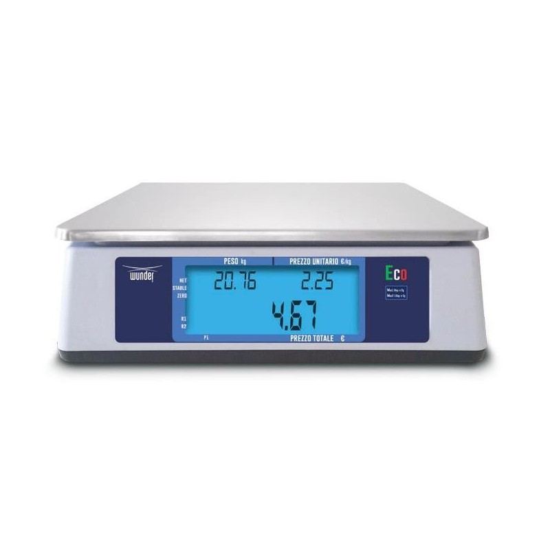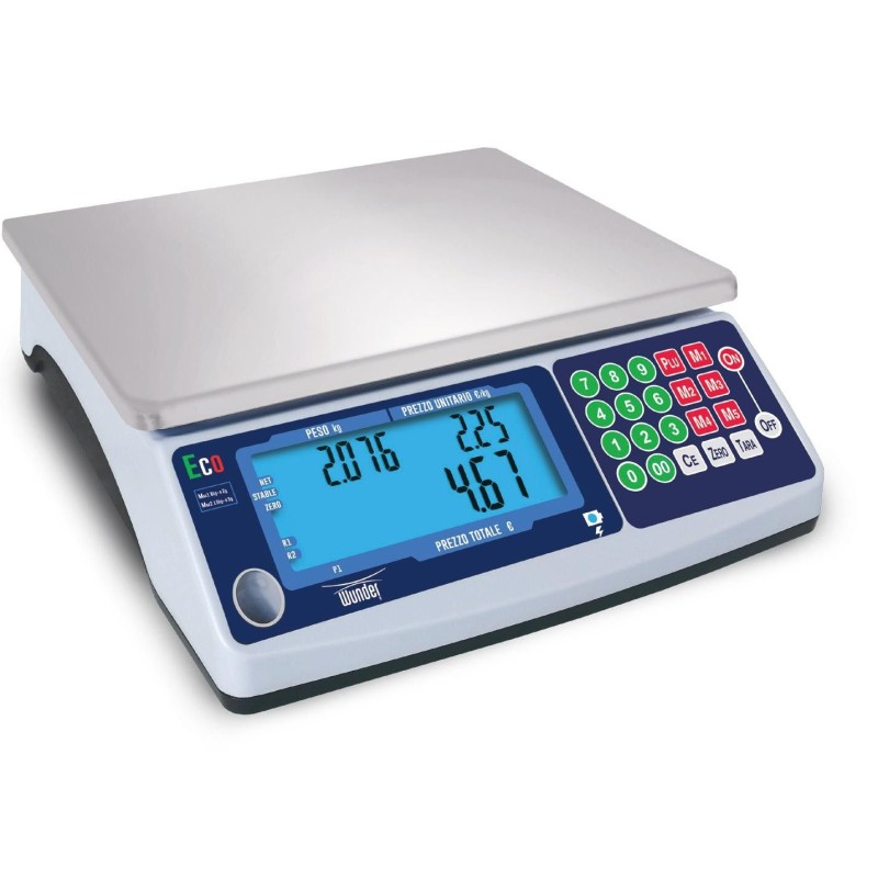 La bilancia elettronica peso-prezzo da banco WUNDER ECO ha una struttura in ABS e funzionamento a cella di carico, tastiera a membrana meccanica con tasti rilievo numerici a colori secondo le funzionalità con 5 tasti memorie dirette. Piano di pesatura in acciaio inox dimensioni 250x215 mm. Dimensioni totali della bilancia 245 x 300 x (altezza)100 mm.