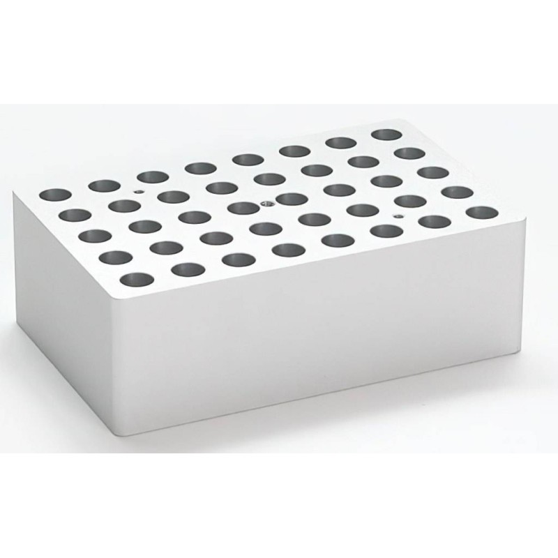 Blocco 40 fori per provette 2 ml. Ogni blocco presenta un filetto centrale per l’estrazione (tramite asta dedicata) e almeno 2 fori per il controllo della temperatura (Ø del foro 3 mm). Ogni blocco è fornito senza asta di estrazione.