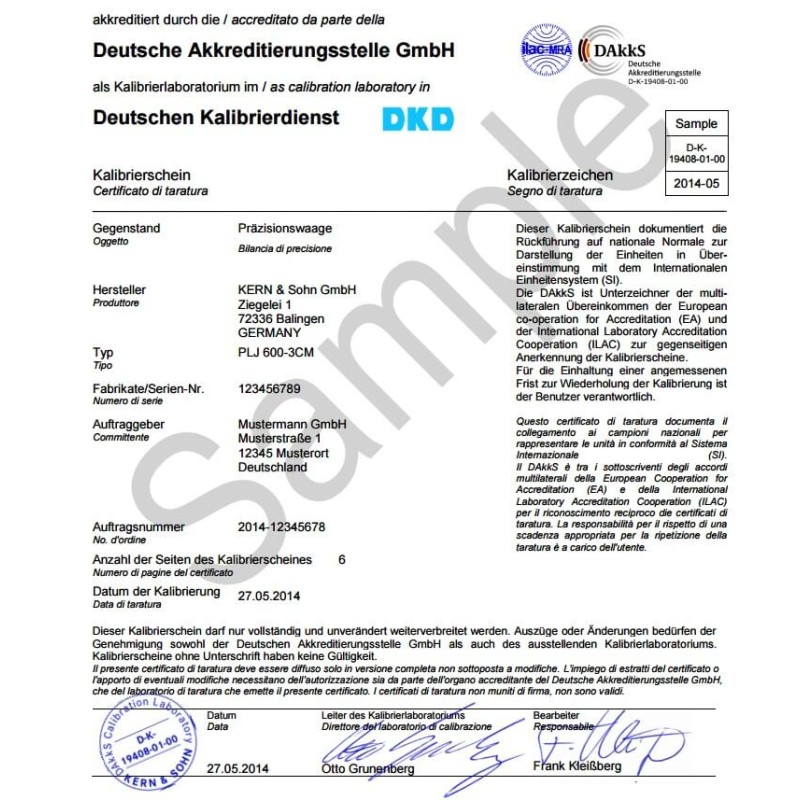 Certificato di taratura accreditato LAT in accordo allo Standard DIN EN ISO/IEC 17025 per bilance industriali Kern con portata compresa da 301 kg fino a 1500 kg. Servizio e prezzi validi solo con acquisto contestuale della nuova bilancia.