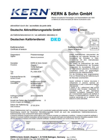 Certificato di taratura LAT conforme alla norma ISO 17025 per sistemi contapezzi modulari CCS con portata fino a 3.000 kg. La taratura copre sia la bilancia di riferimento che la piattaforma satellite collegata. Il certificato, rilasciato da un laboratorio accreditato, include i dati dell'acquirente e viene emesso contestualmente alla data di acquisto del sistema di pesatura.