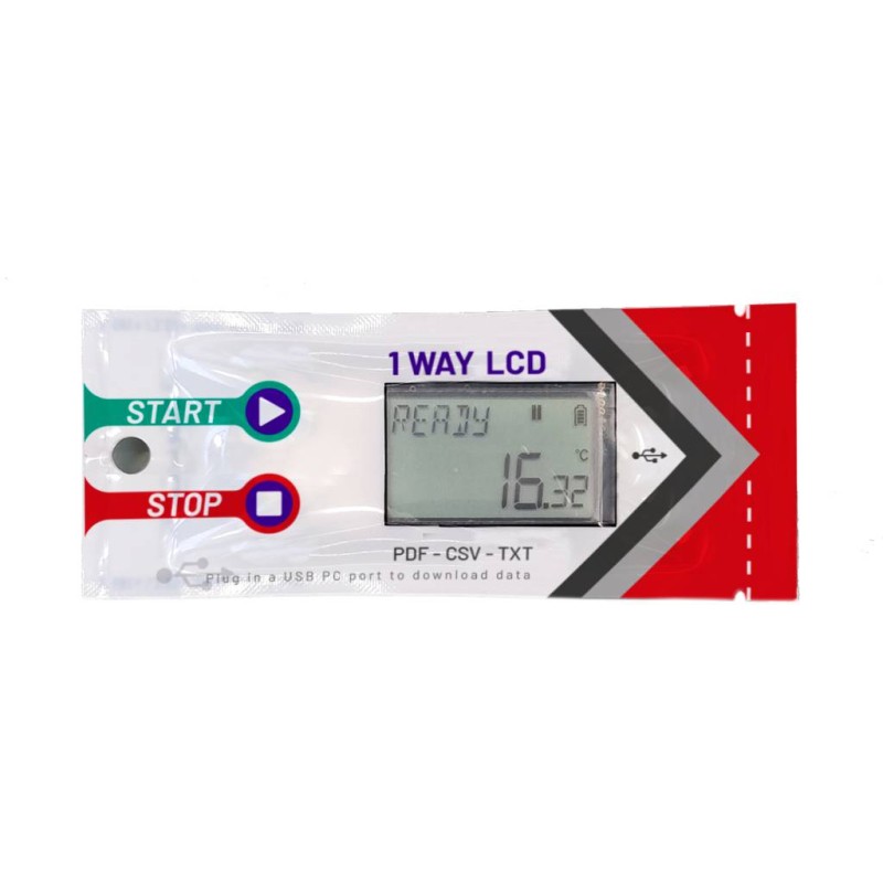 Data logger temperatura monouso MINI 1 WAY XS. Programmato per trasporti refrigerati a +4°C. Intervallo di acquisizione impostato a 5 min. con autonomia di circa 45 giorni. Modelli usa e getta con connessione diretta a PC via USB. Creazione automatica di un file PDF. Fornito in bustina sigillata a tenuta stagna. Anche LCD con display e +capacità di memoria.