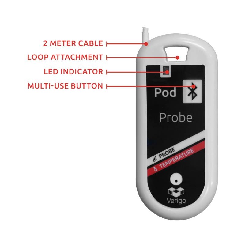 Data logger wireless con sonda Verigo POD PROBE. Per il monitoraggio e la supervisione efficiente di frigoriferi, congelatori, incubatori, ambiente. Campo di misura da -80 fino a +80°C. Sonda esterna con cavo di 2 metri. Nessun software o cavi, gestione via bluetooth tramite smartphone. Web APP Verigo gratuita. Report in pdf o excel.