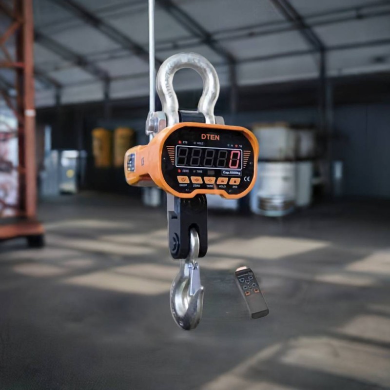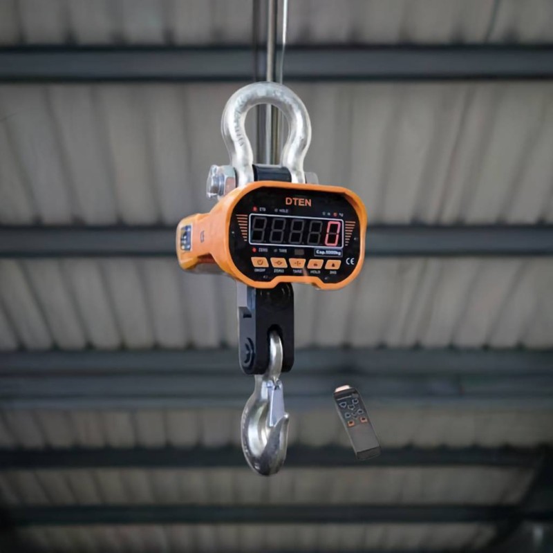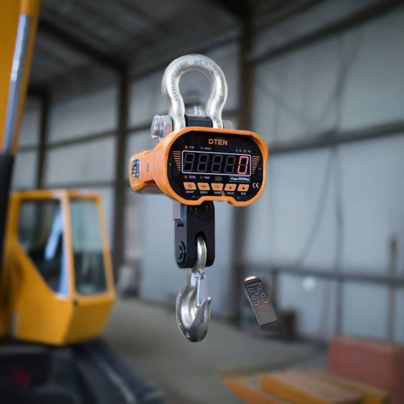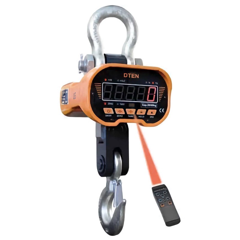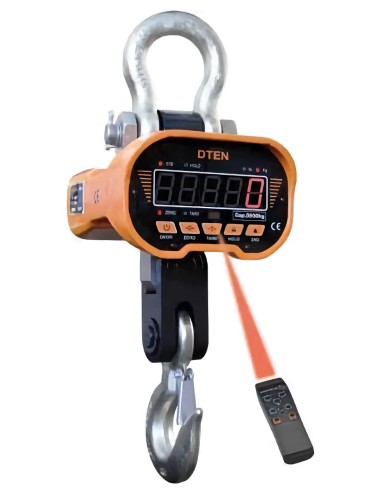 Dinamometro DTEN con portata di 20 ton, completo di gancio e telecomando. Idoneo per carroponte e gru. La soluzione con il miglior rapporto prezzo / prestazioni per i grandi carichi fino a 20000 kg di sollevamento. Precisione di +- 0.03% f.s. Robusto, affidabile, il più venduto per le pesate di controllo in azienda.