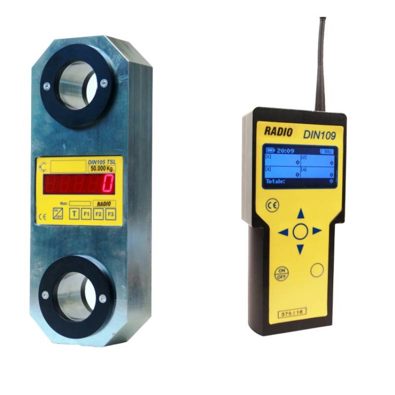 Dinamometro radio 501R elettronico, a trazione a cella di carico. Bilancia per gru con modulo wireless per trasmissione del peso a ricevitore portatile. Ricevitore Radio incluso. L'alta portata (versioni da 35,50,100 e 150 ton ) ed il ripetitore di peso portatile lo rendono indispensabile per la pesatura in cantieri, officine navali o per verifica della portata di carroponte di altissima capacità.