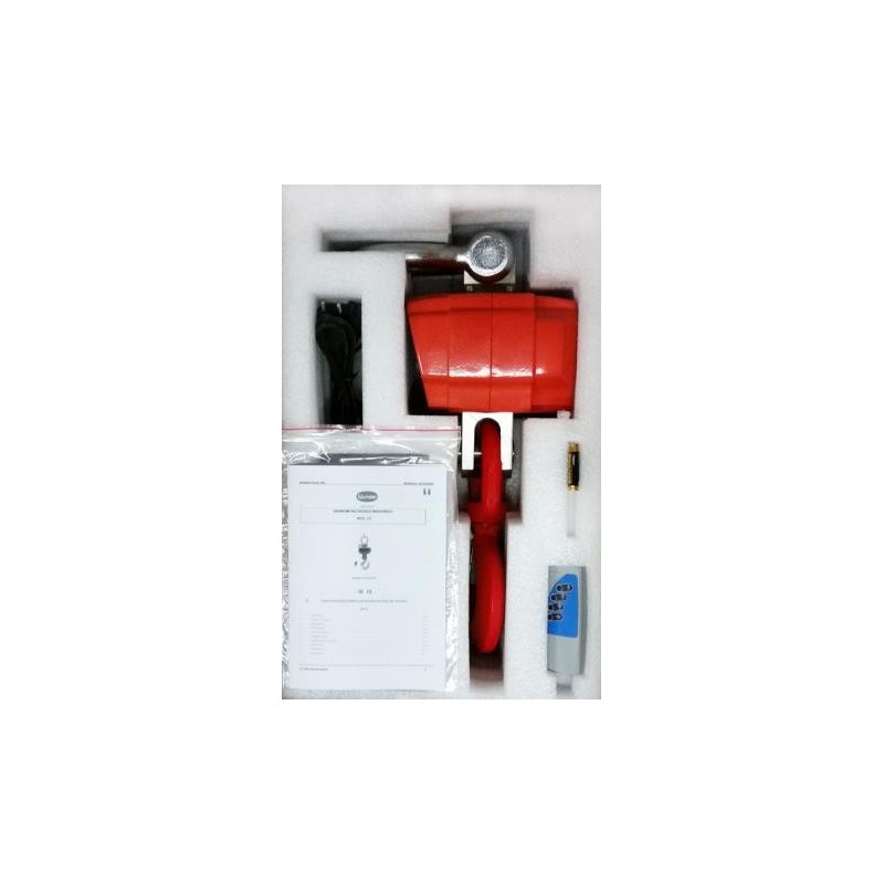 Il dinamometro è fornito con una serie di accessori inclusi, tra cui il telecomando wireless, il gancio girevole a 360°, una batteria ricaricabile, l’alimentatore, due batterie per il telecomando e un manuale d’uso in italiano.