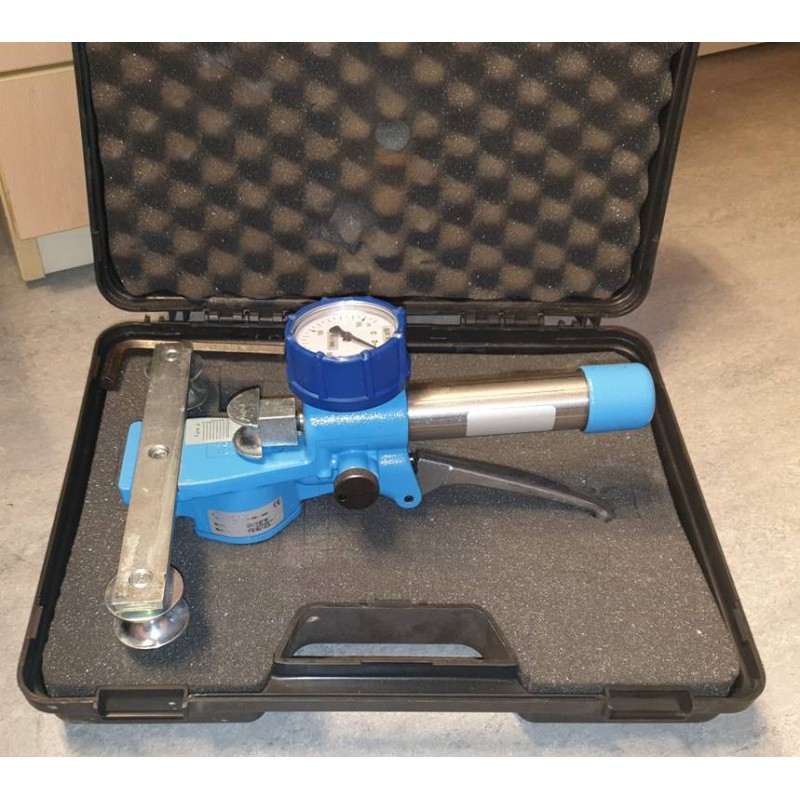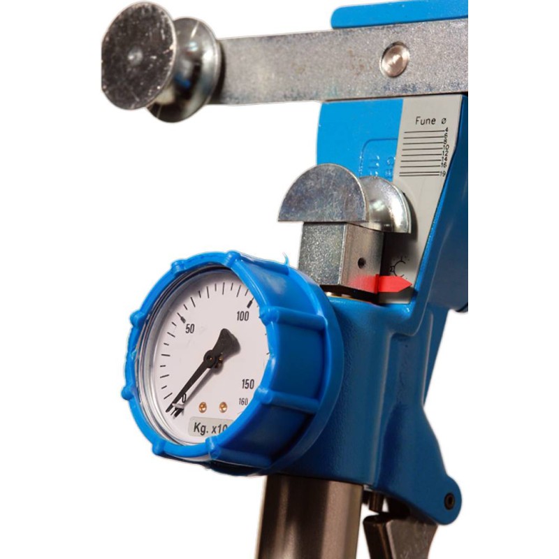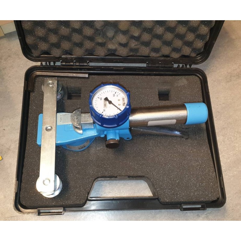 Dinamometro oleostatico a trazione con pistone idraulico e visualizzatore analogico con quadrante. Lo strumento è particolarmente indicato per misure approssimate del carico presente su funi di vari diametri, cavi, tiranti, stralli, sartie e simili già in tensione. Fornito di serie con attestato di conformità e valigetta di custodia.