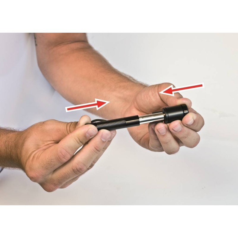 Sensore a rimbalzo: Il modulo di rimbalzo viene fatto scattare da una molla contro l'oggetto di prova. A seconda della durezza dell'oggetto l'energia cinetica del modulo viene assorbita. La decelerazione viene misurata e convertita in valori di durezza Leeb. Sensore a rimbalzo esterno (Tipo D) compreso. Riconoscimento automatico del sensore in collegamento con HMM.