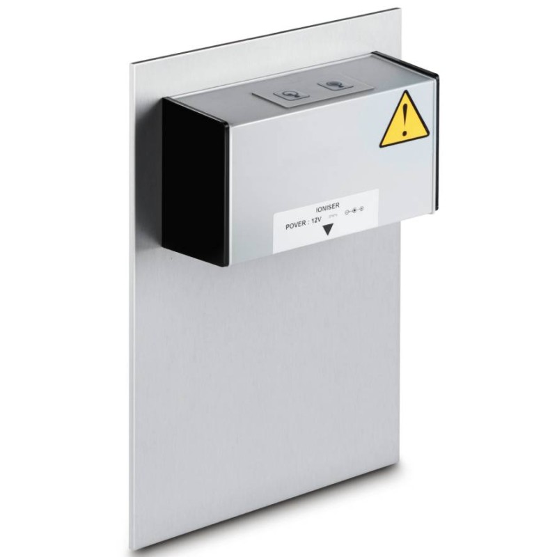 Parete posteriore antivento con ionizzatore integrato per neutralizzare le cariche elettrostatiche, da ordinare contestualmente alla bilancia. Lo ionizzatore è corredato delle lame alimentate con alta