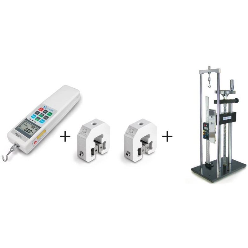 Kit SAUTER TVL 500FHS71 per Misurazione Forza e Lunghezza completo di dinamometro digitale, coppia di morsetti a pinza, banco di prova e calibro digitale. Soluzione super conveniente, pronta all'uso, per misure e test precisi fino a 500 N, ideale per R&S, produzione, controllo qualità. Software e tarature in opzione.