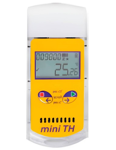 Data logger temperatura e umidità XS MINI TH con grado di protezione IP30 a 1 canale con sensore interno di temperatura e umidità e display multifunzione per la visualizzazione di: valore corrente e valore minimo, massimo e medio della temperatura ed umidità, tempo trascorso dal logger fuori dalle soglie impostate. Marcatura di un evento sul logger tramite pulsante Start.