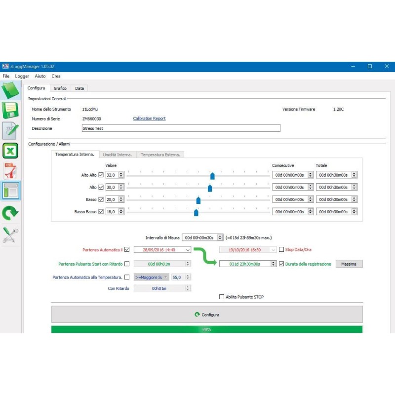 Una volta inserito il datalogger nel computer e aperto il programma zLoggManager, in prossimità della matricola del datalogger nel menù "Configura", è presente il link Statement of Accuracy, cliccando sul link si aprirà il file PDF contenente il certificato di accuratezza del produttore.