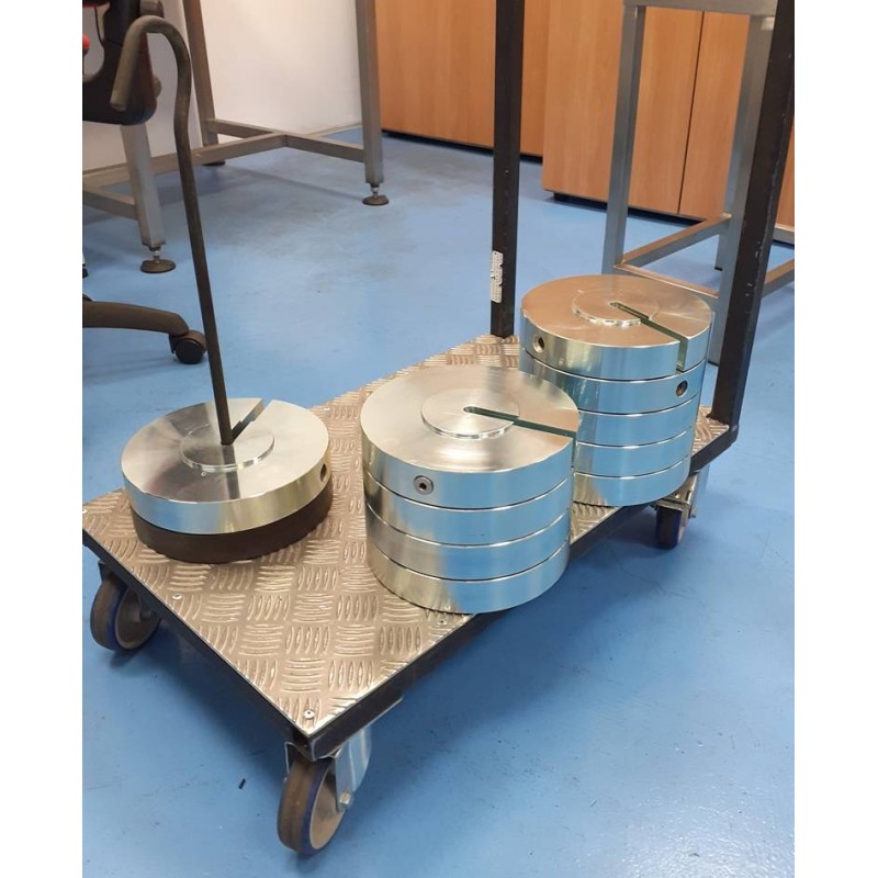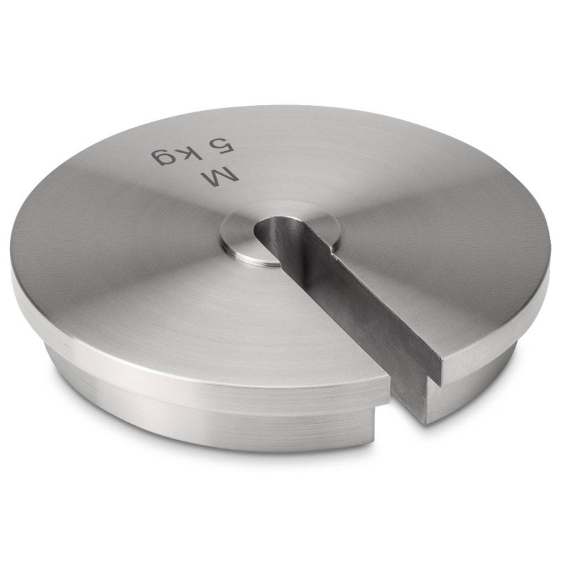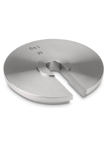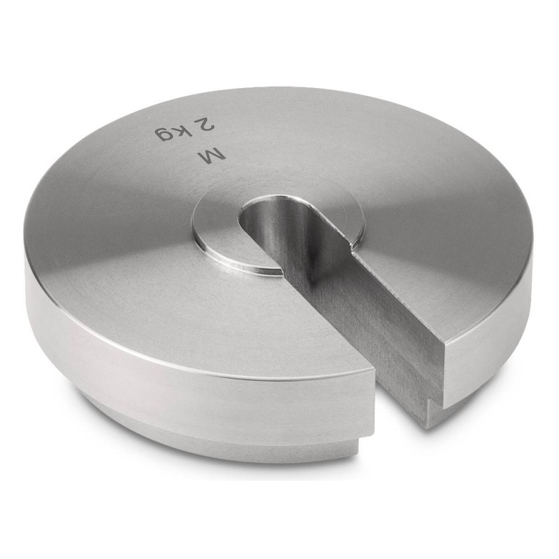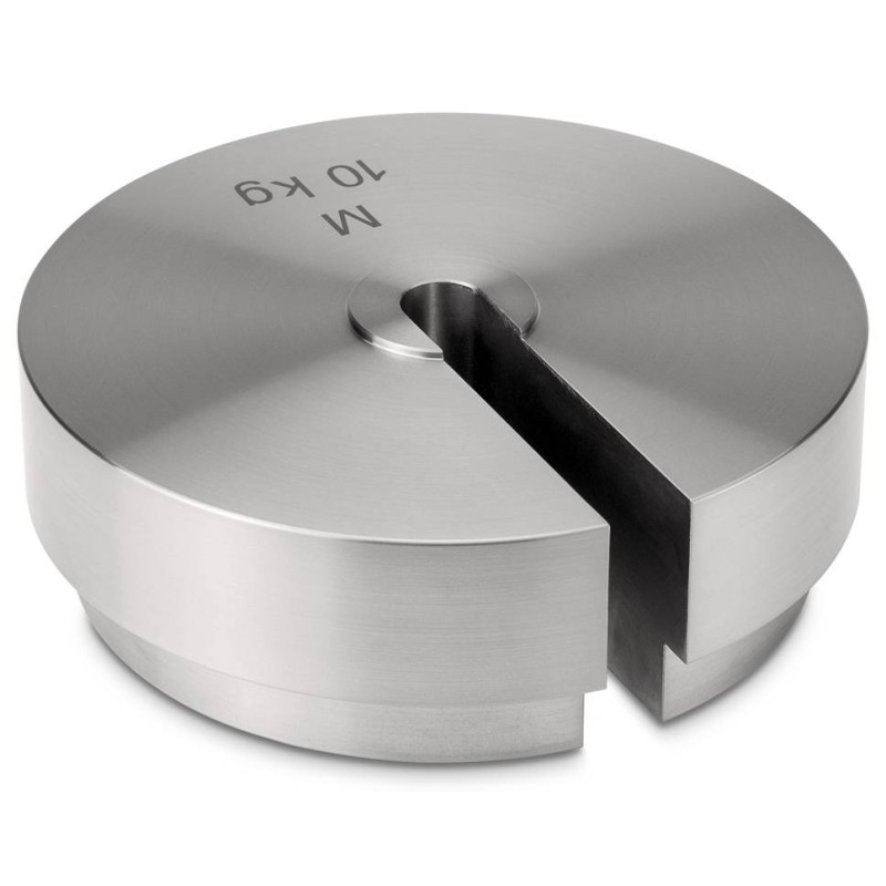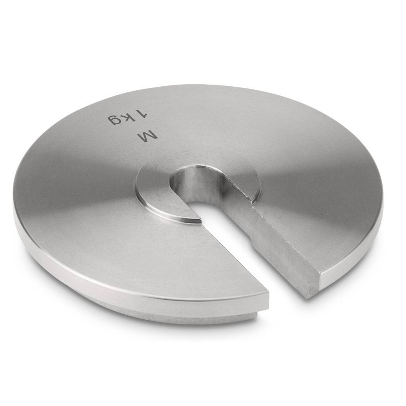 Masse campione a disco con asola e incavo per posizionamento su asta porta pesi. Complete di Certificato di taratura DakkS ISO/IEC 17025 classe di precisione OIML M1. Indispensabili per la taratura di dinamometri, nella metrologia tecnica, in applicazioni industriali e ovunque non sia possibile utilizzare una classica massa cilindrica. Sia l'asta che la singola massa sono certificate.
