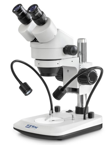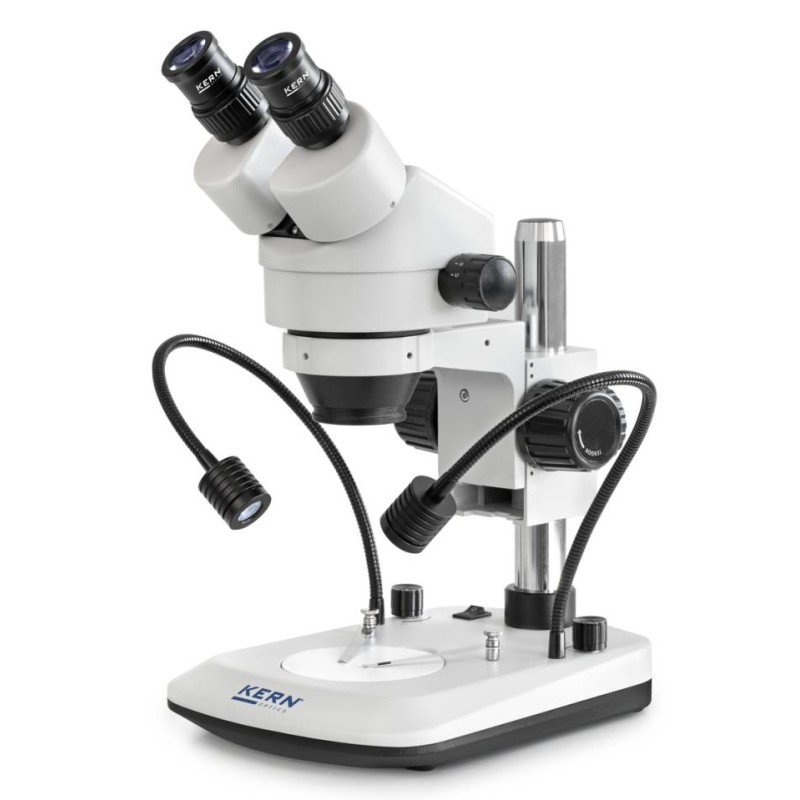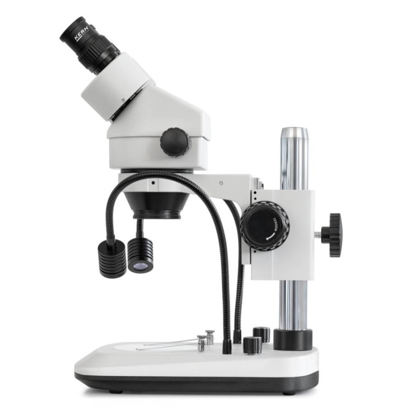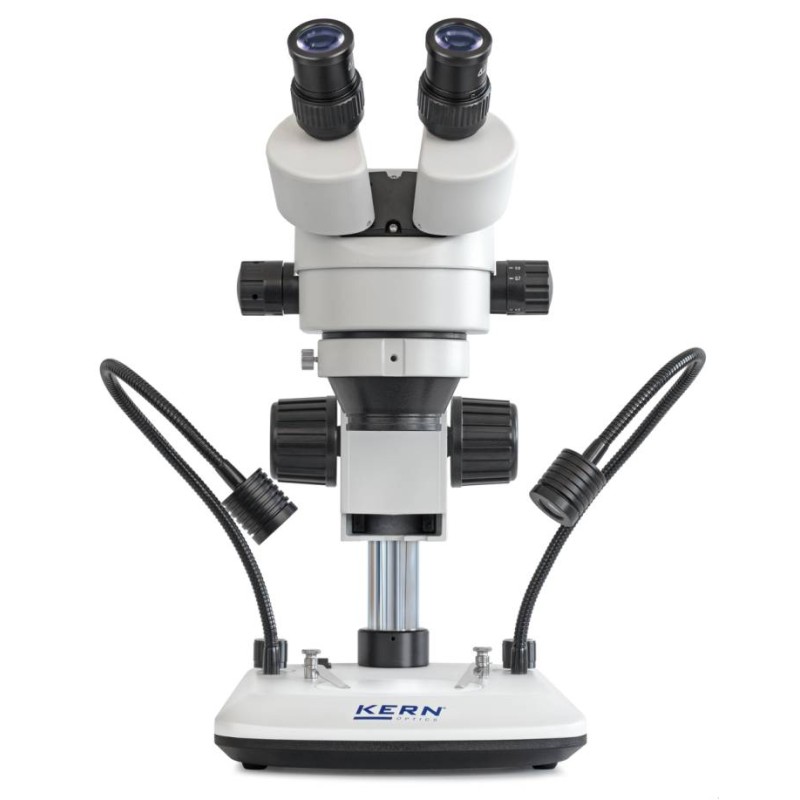 Microscopio Stereo Kern serie OZL-47 con obiettivo zoom per ingrandimento continuo di 7×–45×. Potente sistema di illuminazione LED da 3W a luce riflessa. Due versioni: binoculare o trinoculare. Stativo a colonna incluso, pronto all'uso. Ampia scelta di obiettivi, oculari e adattatori per telecamera/fotocamera. Flessibile, potente, adatto per formazione, centri di prova e laboratori.