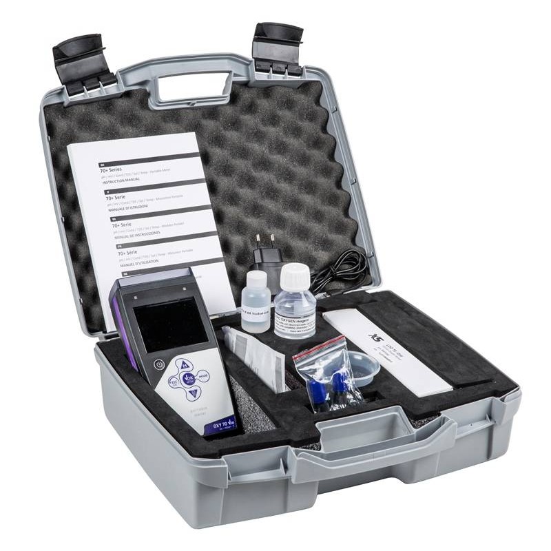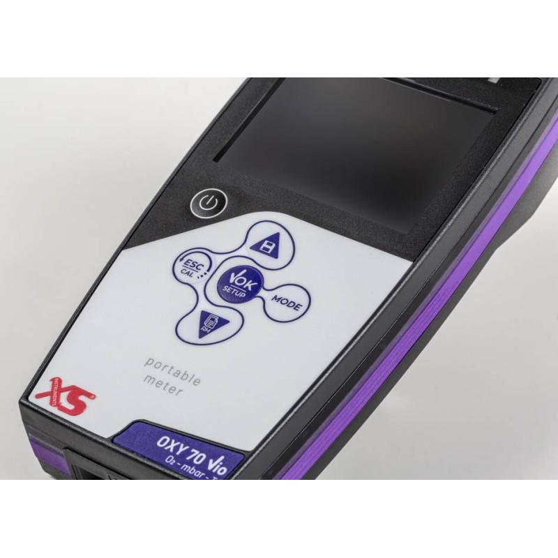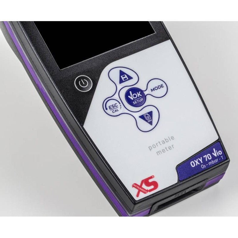 XS OXY 70 Vio Ossimetro portatile digitale con microprocessore a tripla alimentazione (tramite PC, rete e batteria) con uscita USB per collegamento a PC, compensazione automatica della temperatura, della pressione barometrica e manuale della salinità. Completo di sensore ottico Ossigeno, data logger per 1000 dati e sofware per gestione misure da PC.