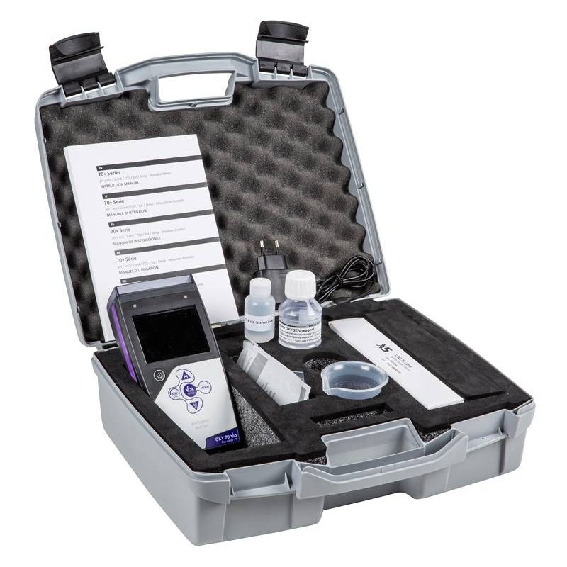 Forniti di serie: sensore polarografico Ossigeno OXY DO7/3MT, 1 membrana di ricambio, soluzione di riempimento (30ml), standard zero ossigeno, istruzioni per l’uso e valigetta da trasporto.