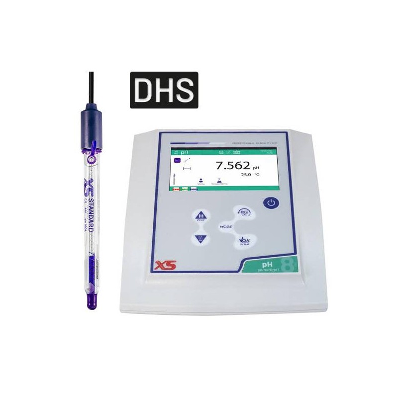Phmetro da laboratorio XS PH 8 PRO DHS, configurato con elettrodo analogico o digitale e/o agitatore con tante funzionalità di supporto. Display grafico, password, 3 punti di calibrazione GLP, allarme in caso calibrazione scaduta, indicazione sullo stato dell'elettrodo. Datalogger + uscita PC/Stampante, menù multilingue, impostazione allarmi su misurazioni. Software di gestione gratuito, di serie.