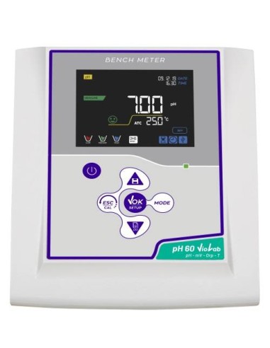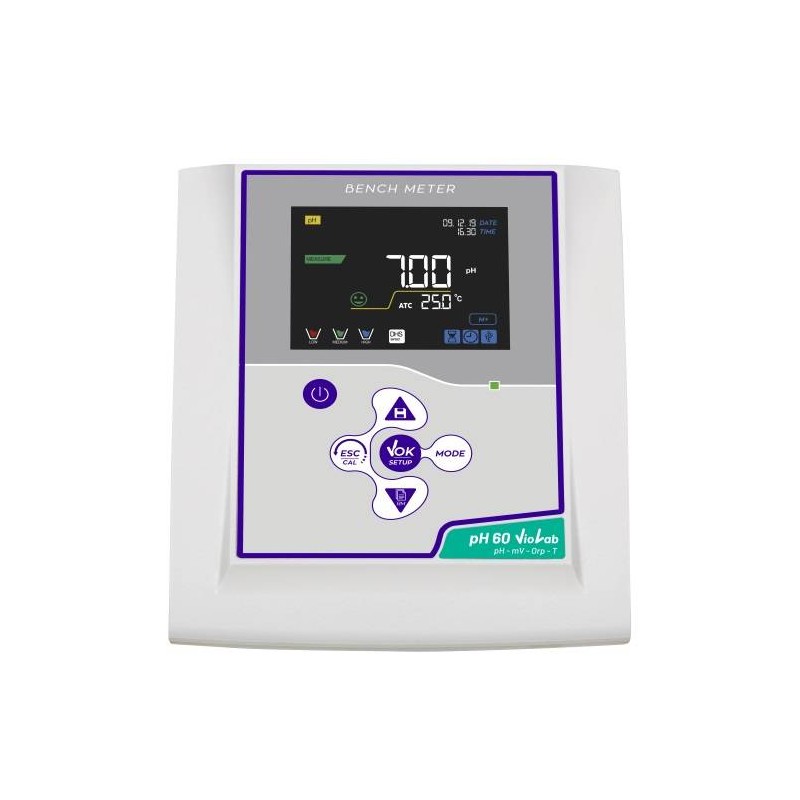 phmetro da banco PH 60 (versione senza elettrodo) con data logger e memoria dati. Innovativo display LCD a colori ad alta definizione mostra tutte le informazioni necessarie come la misura di pH, i buffers utilizzati per l’ultima taratura, la condizione di stabilità. Sensore di tempertaura interno. Manuale d'uso sul display. Calibrazione guidata fino a 3 punti. Compatibile con elettrodi digitali.