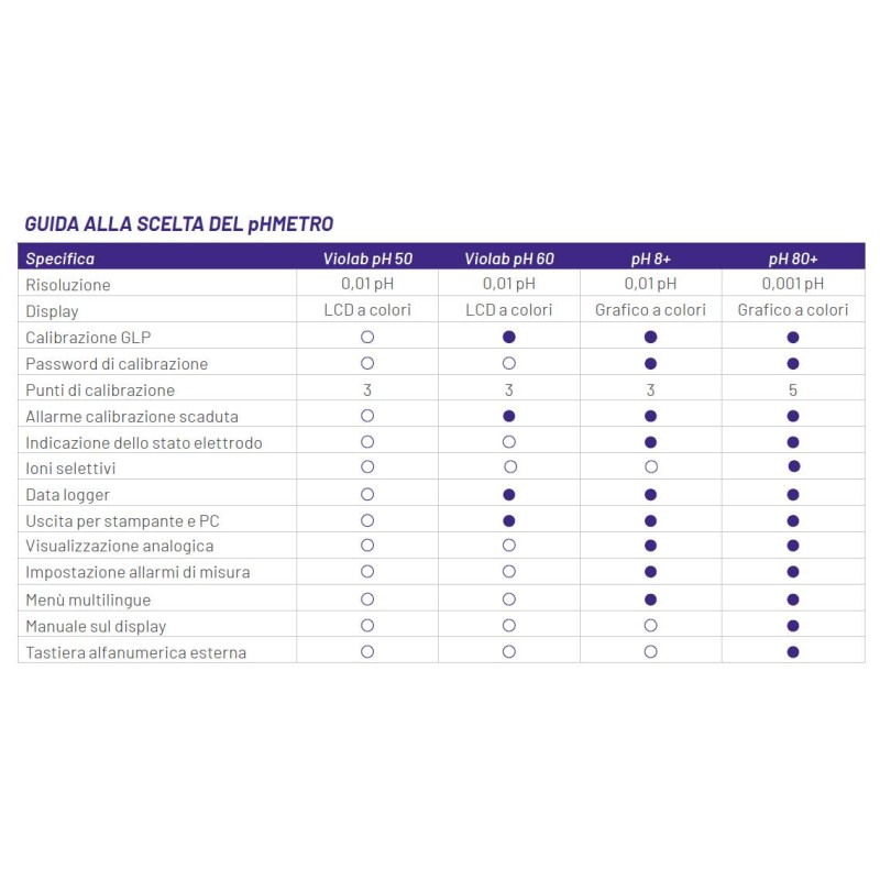 Caratteristiche esclusive del PH 60 VioLab : Funzioni GLP: Data ed ora, visualizzazione dati di taratura ed impostazione scadenza di calibrazione. Data Logger manuale ed automatico con possibilità di scarico dati a PC tramite micro-USB. Software Data-Link scaricabile gratuitamente. Collegamento a stampante esterna tramite connettore RS232.