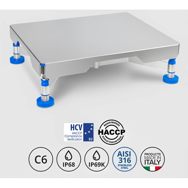 La piattaforma integra una cella di carico in acciaio inox ermeticamente sigillata con grado di protezione IP68 e IP69K, che consente la pulizia con: