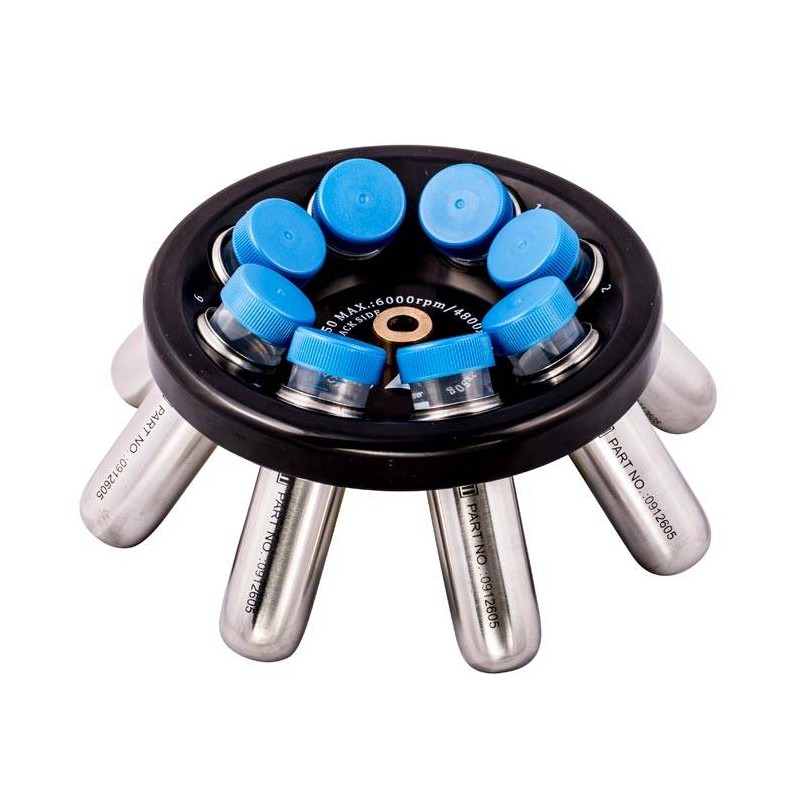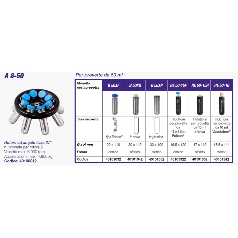 codice 40100812 / A 8-50 : Rotore ad angolo fisso 37° per provette da 50 ml, numero max per rotore 8. Velocità massima 6.000 rpm, accelerazione massima 4.800 xg. Max 8 provette.