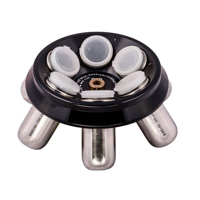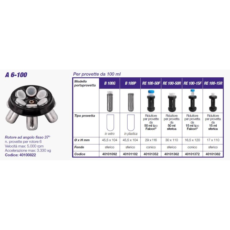 codice 40100822 / A 6-100 : Rotore ad angolo fisso 37° per provette da 100 ml, numero max per rotore 6. Velocità massima 5.000 rpm, accelerazione massima 3.330 xg. Max 6 provette.