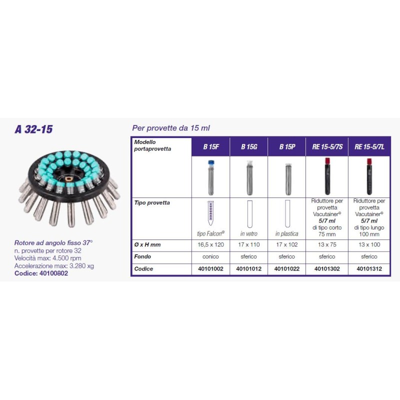 codice 40100802 / A 32-15 N : Rotore ad angolo fisso 37° per provette da 15 ml, numero max per rotore 32. Velocità massima 4.500 rpm, accelerazione massima 3.280 xg. Max 32 provette.