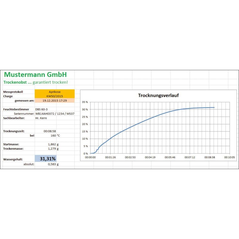 - Stampe di schermate come visualizzazione grande, diagramma di andamento ( curva di essiccazione nei misuratori d’umidità, istogramma, ecc.