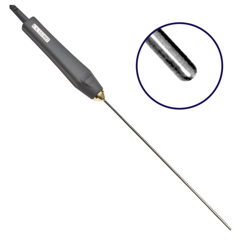 Sonda di temperatura a PT100. Con manico in materiale antiscivolo, resistente e piacevole al tatto. Facile da pulire. Stelo resistente in acciaio inossidabile. Classe di precisione 1/5 DIN, per misure più veloci e accurate. Puntale semisferico per misure in aria e liquidi.