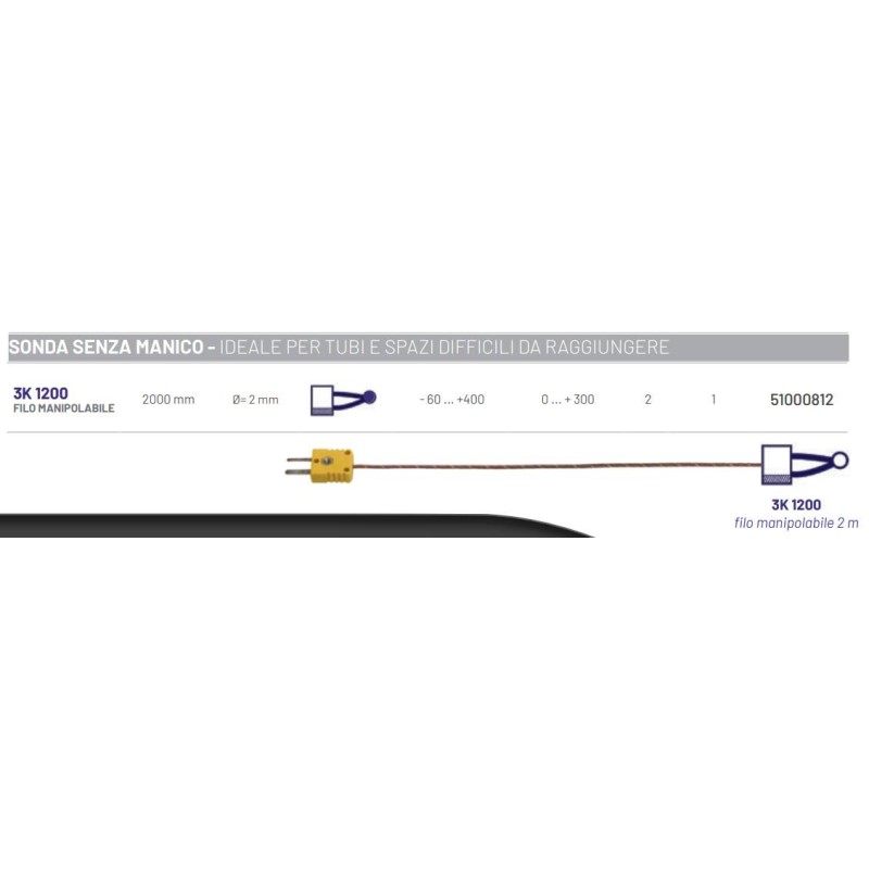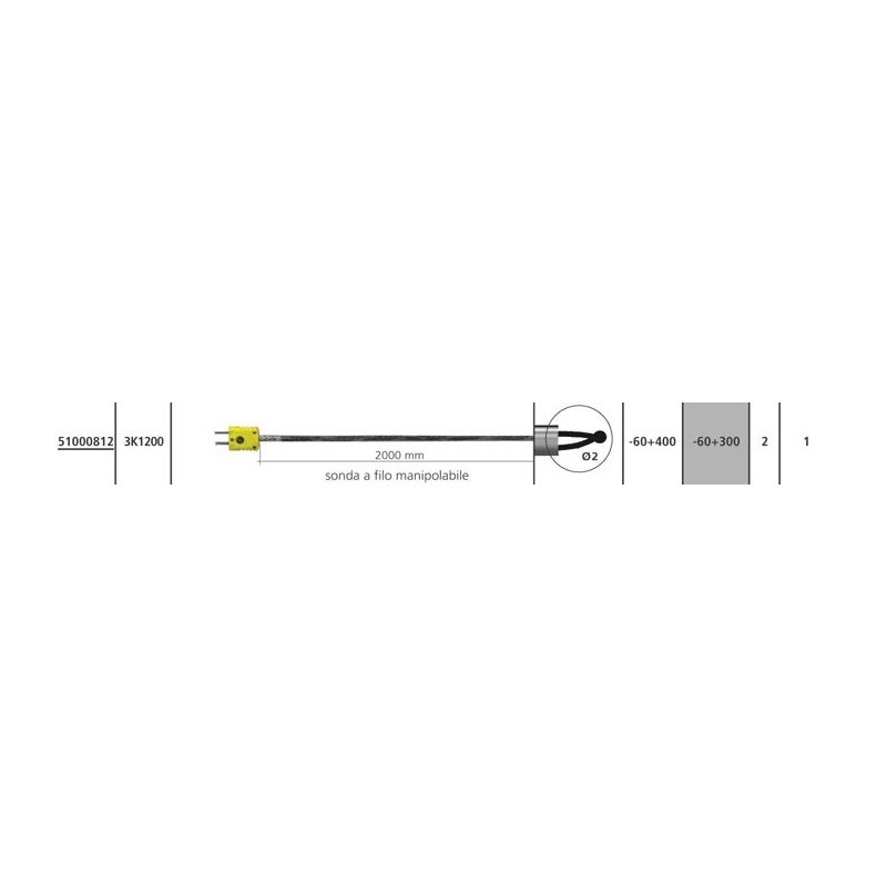 Sonda Termocoppia K a filo, senza manico 3K 1200. Filo manipolabile, lunghezza 2 metri. Ideale per passaggio in tubi o per spazi difficili. Da -60 a +400 °C. Tempi di risposta tra i più veloci in assoluto, in soli 2 secondi misura il 90% della temperatura totale. Certificabile. Classe 1.
