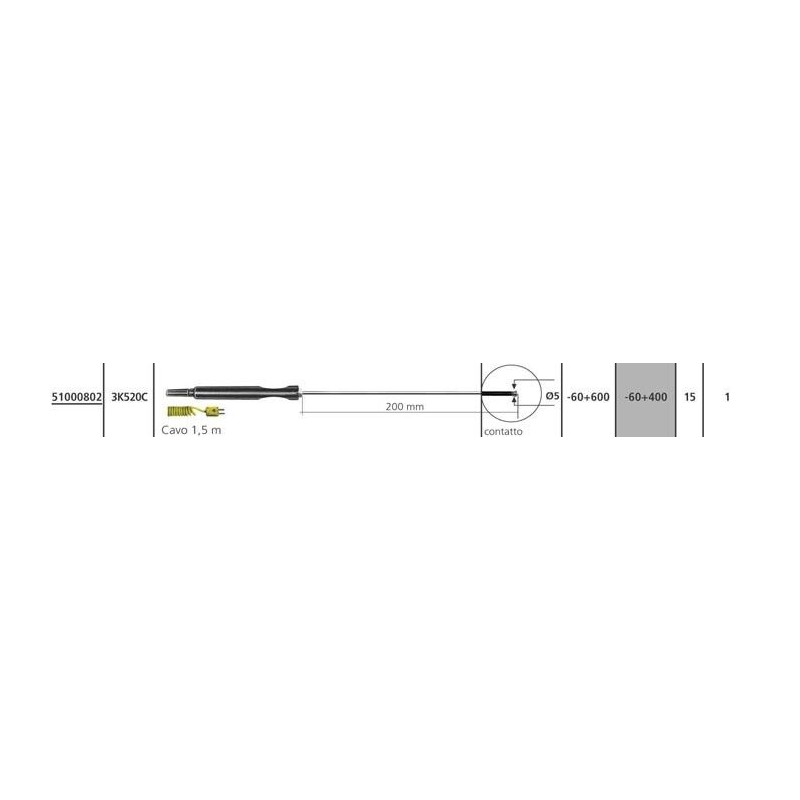 onda di temperatura Termocoppia K mod. 3K 520 C. Con manico in materiale antiscivolo e resistente. Facile da pulire. Stelo resistente in acciaio inossidabile. Puntale piatto per misure a contatto con le superfici.