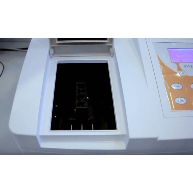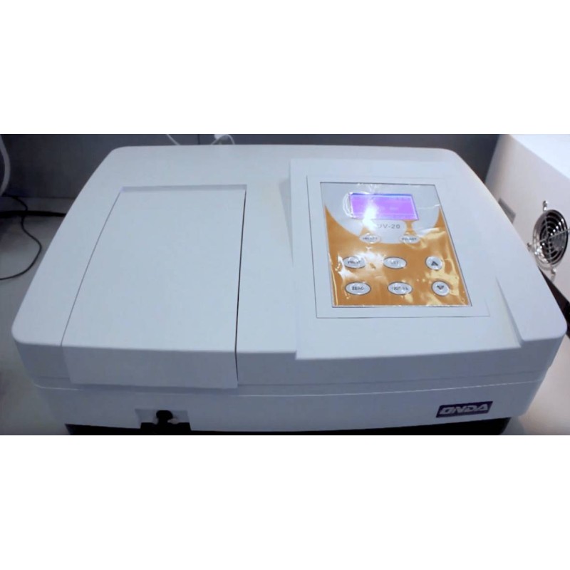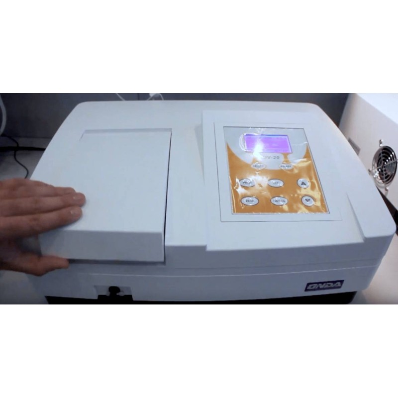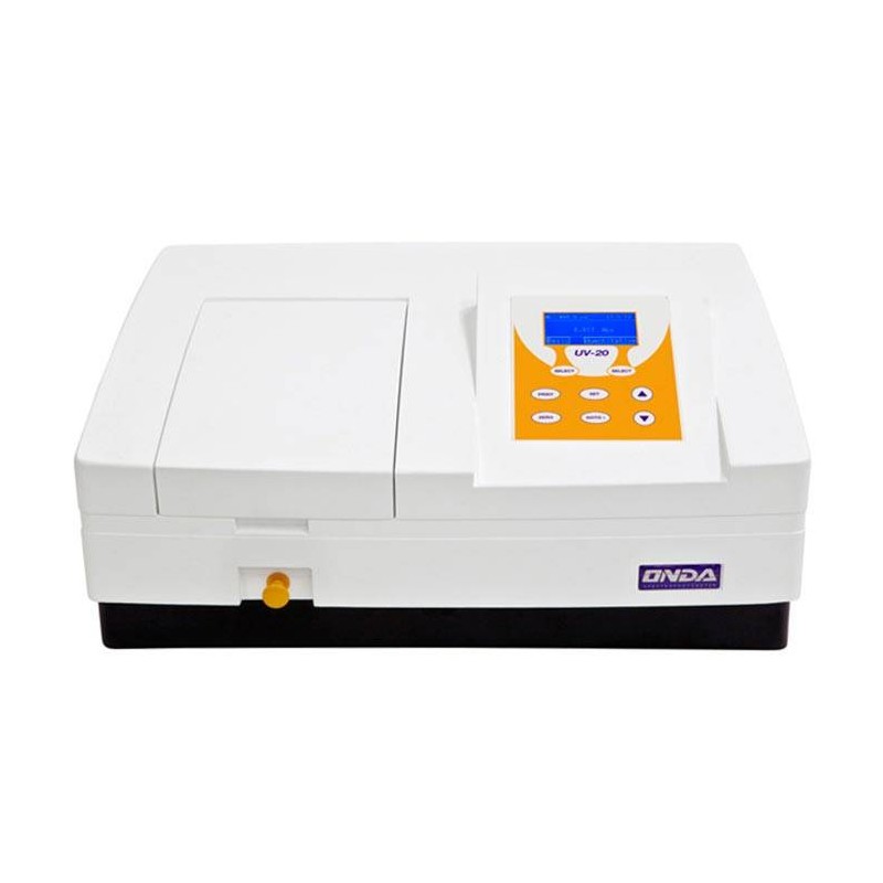 Spettrofotometro ONDA UV-20 UV-Visibile, campo spettrale 200-1000 nm. Impostazione automatica della lunghezza d’onda Goto . Sistema ottico singolo raggio, banda passante 4 nm, risoluzione spettrale 0,1 nm, accuratezza delle lunghezze d’onda ±1nm, precisione delle lunghezze d’onda ±0,5nm accuratezza fotometrica ±0,5%T, precisione fotometrica ±0,3%T. Range fotometrico 0…200%T, -0,3…3Abs, 0…9999Conc. Luce diffusa <0,2%T.