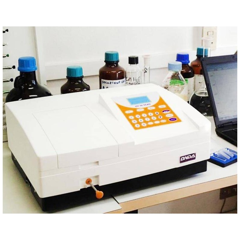 Spettrofotometro ONDA UV-30 SCAN UV-Visibile, campo spettrale 190-1100 nm. Impostazione automatica della lunghezza d’onda Goto . Sistema ottico singolo raggio con sottrazione automatica del bianco, banda passante 2 nm, risoluzione spettrale 0,1 nm, accuratezza delle lunghezze d’onda ±0,5nm, precisione delle lunghezze d’onda ±0,3nm accuratezza fotometrica ±0,3%T, precisione fotometrica ±0,2%T. Range fotometrico 0…200%T, -0,3…3Abs, 0…9999Conc. Luce diffusa <0,05%T.