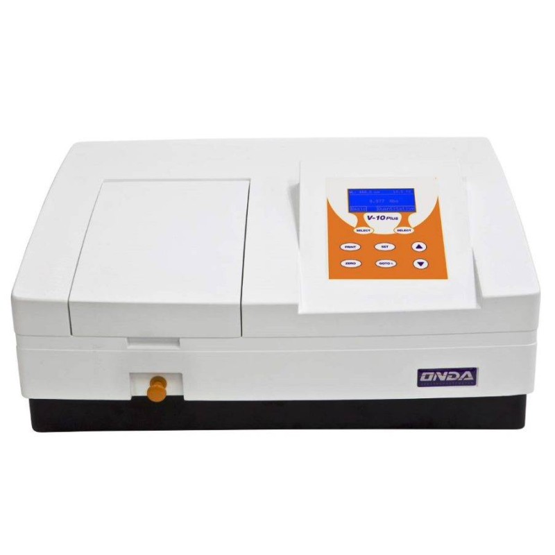 Spettrofotometro ONDA V-10 Plus Spettrofotometro Visibile con settaggio automatico della lunghezza d’onda, campo spettrale 325-1000 nm. Sistema ottico singolo raggio, banda passante 4 nm, risoluzione spettrale 0,1 nm, accuratezza fotometrica ±0,5%T, precisione fotometrica ±0,3%T. Range fotometrico 0…200%T, -0,3…3Abs, 0…1999Conc.