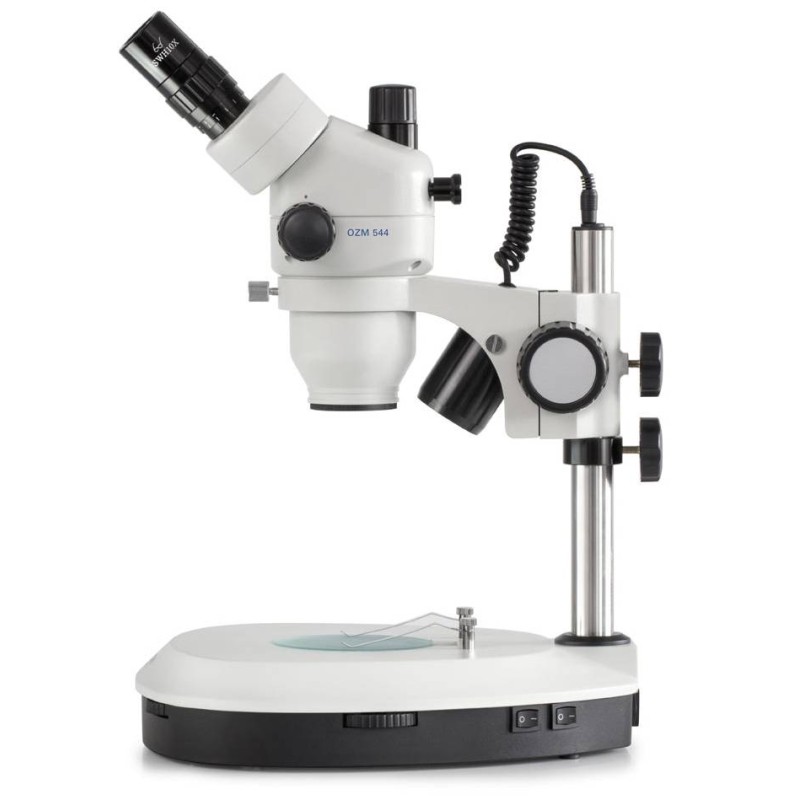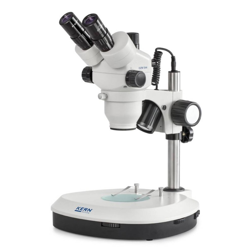Stereomicroscopio a Led Kern OZM-5. Ingrandimento zoom 7x-45x. Garantisce immagini dai colori fedeli e dalla massima nitidezza con elevato contrasto. Potente illuminazione LED a luce incidente e passante a 3W, vantaggioso quando è necessaria una maggiore luminosità per visualizzare dettagli più fini e/o per ottenere un alto contrasto tra il campione e lo sfondo. Versioni Binoculare o Trinoculare.