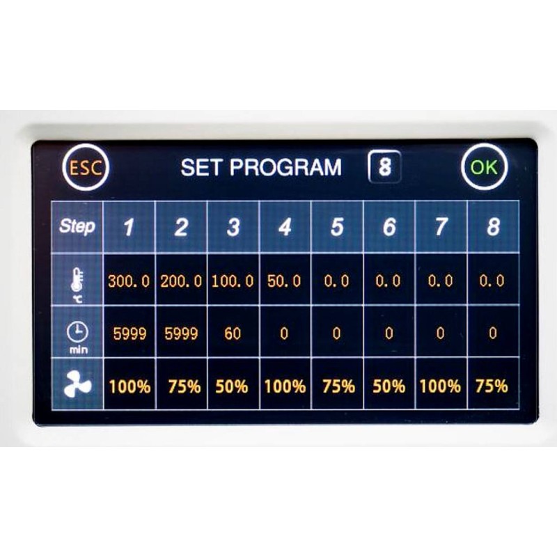 Versione SUPER, display a colori touch screen, 8 programmi memorizzabili con 8 step ciascuno (temperatura, tempo) ed un ulteriore programma di base a singolo step di funzionamento (temperatura, tempo, velocità di ventilazione). Registrazione dei dati di lavoro senza limite su chiavetta USB fornita in dotazione.