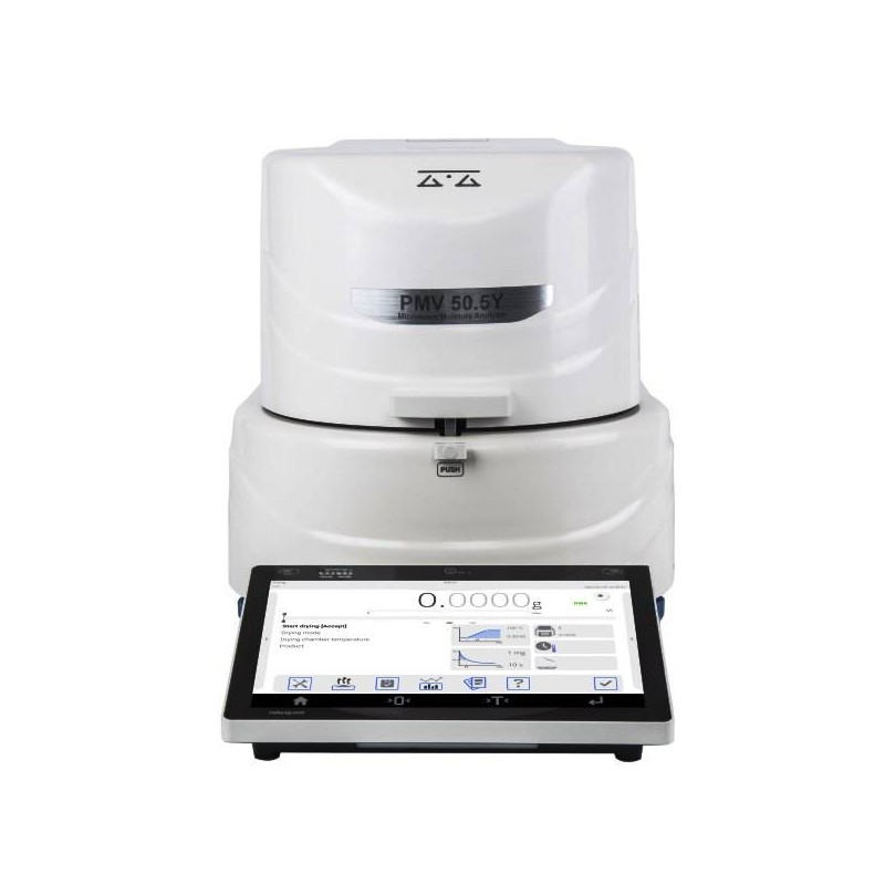 - tempo di asciugatura ultra-breve rispetto ai tradizionali analizzatori di umidità e ai metodi di asciugatura standard. La durata media di questo processo dipende dal tipo e dalla massa della sostanza utilizzata e richiede da 1 a 10 minuti . Al contrario, con i tradizionali analizzatori di umidità alogeni occorrono da 5 a 40 minuti . PMV 50.5Y è dotato di un sensore di temperatura e consente di monitorare la potenza del dispositivo per evitare il superamento del punto di ebollizione durante il processo. La potenza del microonde preimpostata viene visualizzata sull'indicatore durante tutta la procedura di asciugatura.