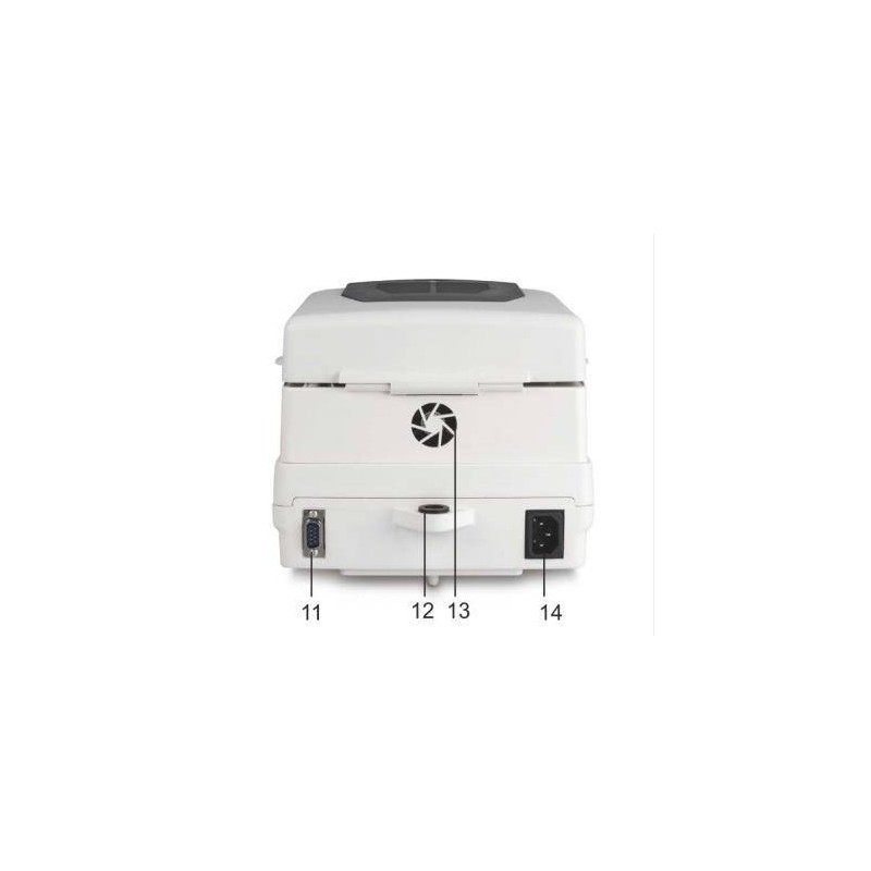 Display retroilluminato. Piatto di pesata tondo con diametro 90 mm in acciaio inox. Protocollo di utilizzo GLP. Memoria interna per lo svolgimento automatico di 15 cicli di essiccazione. Tre metodi di essiccazione: Soft, Standard e Fast. Lampada alogena da 400W. Fornita con massa campione per la taratura e il controllo e 50 piattelli in alluminio. Uscita RS 232 di serie per collegamento a PC o con la stampante. Certificato di taratura riferibile Accredia incluso nella fornitura.