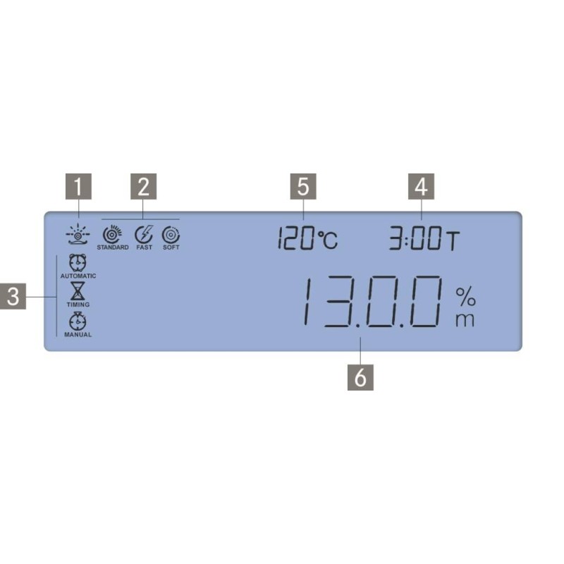 Il display LCD, retroilluminato, con cifre da 14 mm mostra : Processo d'essiccazione attivo; Profilo di riscaldamento attivo; Criterio di spegnimento attivo; Tempo d'essiccazione trascorso; Temperatura attuale; Visualizzazione umidità in %; Risultato intermedio in umidità %.