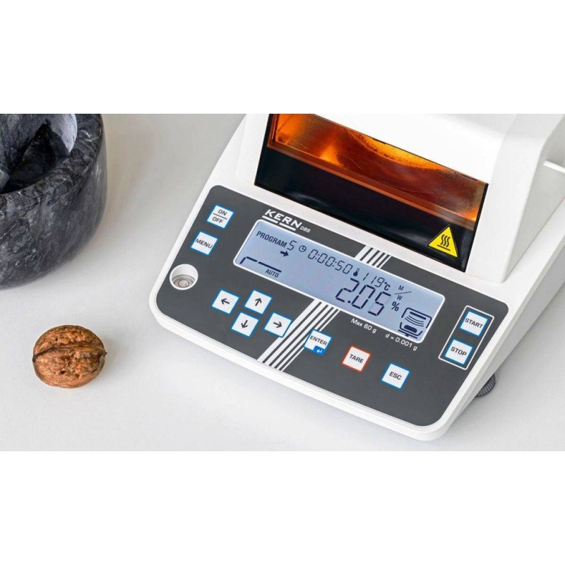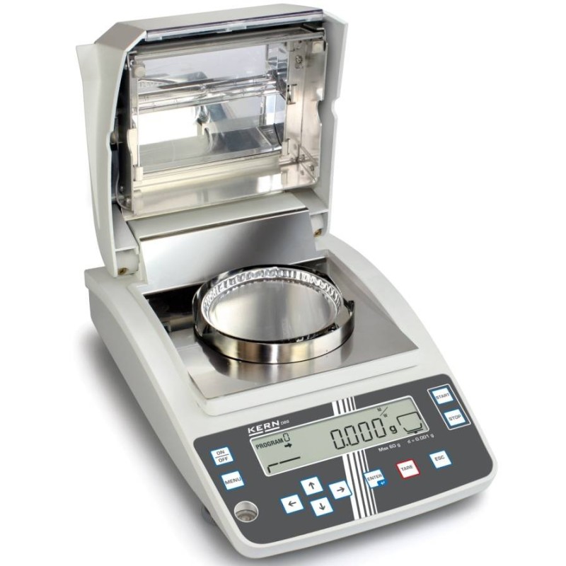 In laboratorio o in produzione, nel mondo alimentare o chimico conoscono bene quanto sia importante il controllo del contenuto di umidità nei prodotti. Kern con la DBS 60-3 ha creato la termobilancia perfetta : veloce, pratica, accurata e conveniente nel prezzo. La DBS è un prodotto in vendita da molti anni ed ha caratteristiche che la rendono vincente su ogni aspetto rispetto a termobilance similari. Lo strumento serve per la determinazione di umidità di materiale in sostanze liquide, porose e solide, in base ad analisi termogravimetrica.